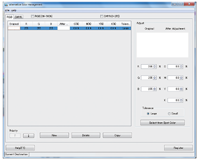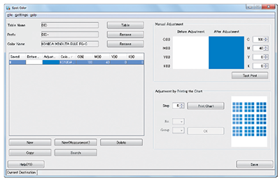 ![]() Spot colour editing A function to set special colours designated by the user. Capable of registering colours directly by selection from the colour chart |
