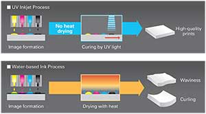 The use of UV ink eliminates problems such as waviness or curling commonly occurring during processes such as thermal fixing and drying to achieve superb print quality and highly-accurate registration.